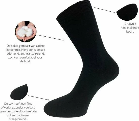 Set van 10 paar damessokken in de kleur zwart. Deze fijne dunne dames sokken zijn gemaakt van 100% katoen waardoor de sokken extra zacht aanvoelen. Deze damessokken zijn ademend, anti-transpirerend en hebben een handgekettelde afwerking zonder voelbare naad op de tenen. De niet knellende boord zorgt voor een optimaal draagcomfort. 100% katoenen sokken zijn helaas minder elastisch waardoor een katoenen sok niet stevig om je been zit, maar soepel valt, hierdoor zijn deze sokken ook ideaal als diabetes sokken. Deze damessokken zijn verkrijgbaar in de maten 35-38 en 39-42.
