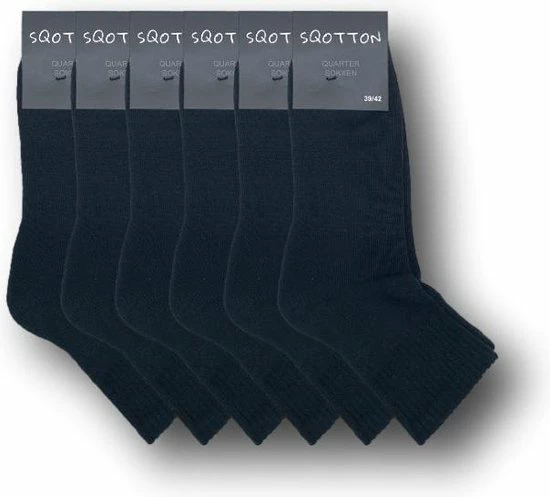 Set van 6 paar quarter sneakersokken in de kleur zwart van het merk SQOTTON. Deze quarter sneakersokken hebben een halfhoge boord die tot boven de enkel valt. De quarter sneakersokken hebben een prettig draagcomfort en zijn een ideale basic voor dagelijks gebruik of om te dragen tijdens sporten. De sokken hebben een badstofvoering aan de onderkant, vanaf de teen tot boven de hiel. Hierdoor zijn de sokken vocht absorberend en licht schokdempend. Dankzij het hoge percentage katoen zijn deze quarter sneakersokken ademend, anti-transpirerend en voelen de sokken zacht aan. De set van 6 paar quarter sneakersokken zijn verkrijgbaar in diverse kleuren en maten.