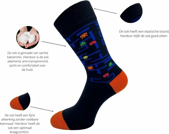 Set van 8 paar vrolijke SQOTTON sokken met retro game print. Deze sokken met print hebben een hoog draagcomfort en zijn daarom ideaal voor dagelijks gebruik. De sokken zijn gemaakt van een zachte katoenmix. Hierdoor zijn de sokken ademend, anti-transpirerend en comfortabel voor je huid. De sokken hebben een elastische boord waardoor de sokken goed blijven zitten. Daarbij hebben deze vrolijke sokken een handgekettelde afwerking zonder voelbare naad bovenop de tenen. Een afwerking zoals deze wordt ook wel naadloos genoemd. De print op deze sokken doet denken aan de retro game pac man. Deze naadloze sokken met print zijn unisex, geschikt voor zowel dames als heren. De sokken worden geleverd in een voordeelpak van 8 paar en zijn verkrijgbaar in de maten 36-40 en 41-46.