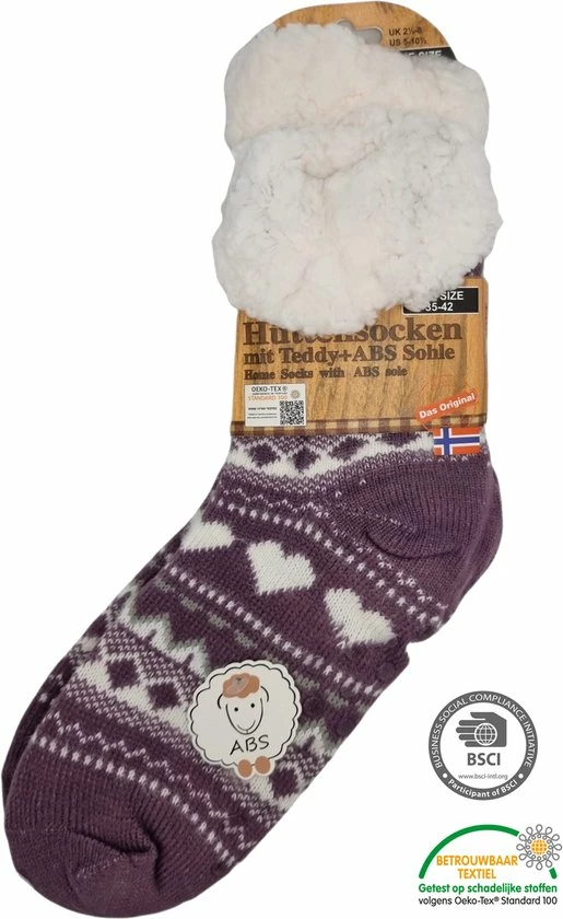 Deze huissokken zijn van binnen gevoerd met super soft teddy materiaal waardoor je voeten lekker warm blijven en bevatten een ABS zool (Anti slip) waardoor u veel grip heeft op de grond en dus niet zo maar uit kan glijden. De sokken zijn 100 % gemaakt van polyacryl en kunnen gewassen worden op 30 graden.