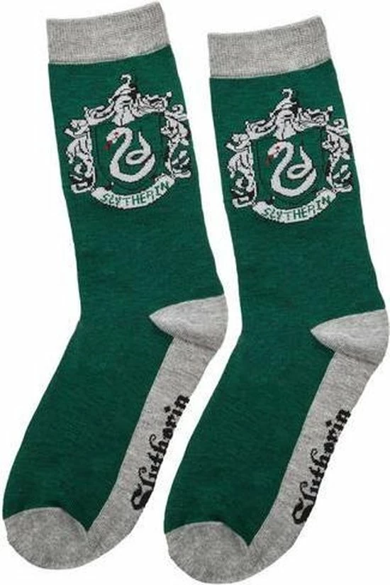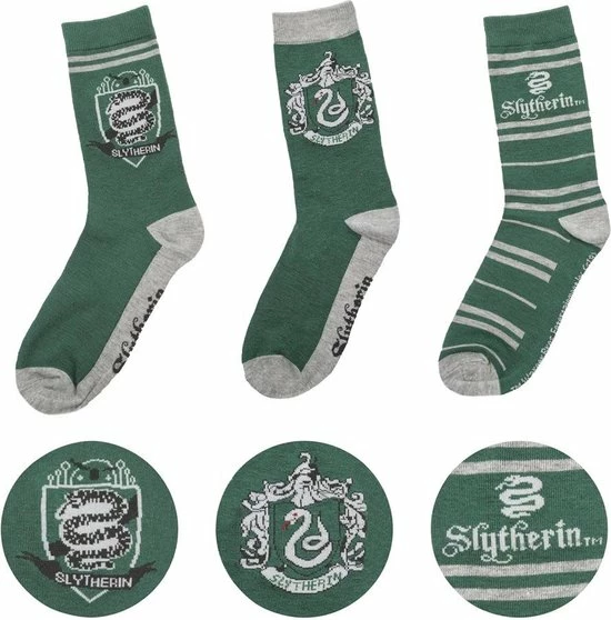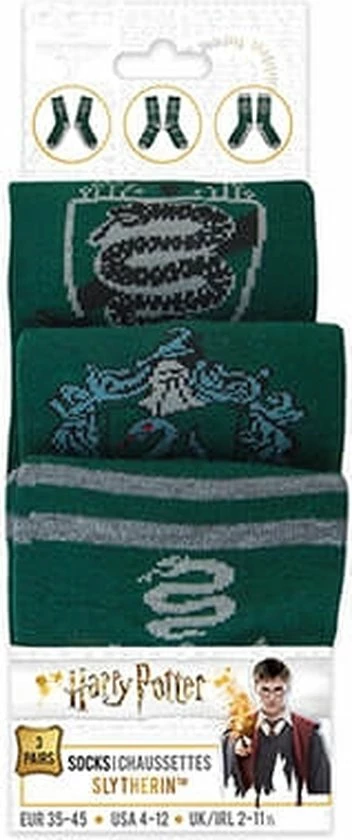Set van 3 paar Slytherin / Zwadderich sokken van Harry Potter.Materiaal: 70% polyester, 20% nylon en 10% spandexMaat: 37 – 46 / US 6-12One size fits most