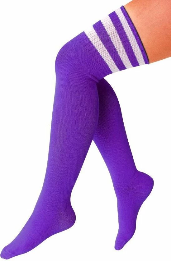 Maak jouw outfit nu compleet met deze paarse kniekousen met witte streepjes! Deze sokken tot aan de knie kun je dragen bij veel gelegenheden: als voetbalsokken, hockeysokken, rugbysokken, sportsokken, onder je rockabilly outfit, college outfit, cheerleader outfit, tiroler lederhosen, naar een festival in je sneakers, thuis op de bank of elke gelegenheid die jij maar kunt verzinnen!