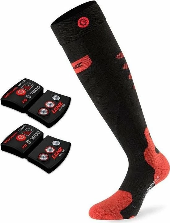 Set bestaat uit 1 paar Lenz 5.0 ergonomisch gevormde sokken met verwarmingselement. 2x Lithium 1200 accu, en 1x duo-acculader.