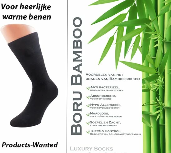* Bamboe volledig badstof gevoerde lange sokken * Extra draagcomfort doordat de sokken soepel en zacht aanvoelen * Merk Boru * Thermo-control * Geen knellende kraag * Droog en schoon gevoel * Met de hand genaaide gladde teen naden * Wassen wasmachine, maximaal 30 graden * Bamboe ventileert beter dan katoen * Uw voeten extra worden beschermd in de zomer tegen de hitte en in de winter tegen koude temperaturen * Ruikt langer lekker fris * Voor mannen en vrouwen * Zijdezacht * Hypoallergeen, dus geschikt voor de gevoelige huid * Absorberend, de bamboe sokken nemen vocht op * Geen geïrriteerde tenen door het naadloze design * De luxe bamboe sokken zijn hypo allergeen, anti bacterieel ademend en absorberend * Deze fijne zachte sokken zijn naadloos * Duurzaam * Door de lichte glans welke het bamboe materiaal met zich mee brengt geeft uw sokken een luxe uitstraling * Samenstelling 80% bamboe,17% polyamide en 3% elastane * Kleur zwart * Milieubewust,, Boru Bamboe Sokken Kneehigh Zwart Boru Bamboe Sokken Kneehigh Zwart 3 paar ,, Maat 46-47,,Deze superzachte sokken van bamboe voelen aan als een 2e huid. De sokken zijn hypo allergeen, anti-bacterieel, ademend en absorberend. Hierdoor blijven ze tot 3x langer fris dan gewone katoenen sokken. De sokken bestaan voor 80% uit bamboe. Deze verhouding is perfect om de stevigheid van normale sokken te behouden maar toch het ultiem zachte gevoel van hoge kwaliteit bamboe te garanderen. Daarnaast zijn de bamboe sokken naadloos voor een aangenamer gevoel. Ook zijn de bamboe sokken een stuk duurzamer dan katoenen sokken. Dit komt doordat de productie van bamboe een stuk minder milieubelastend is dan dat van katoen. Zo is er een stuk minder kostbaar water nodig en worden er geen pesticiden gebruikt in het verbouwen van bamboe.