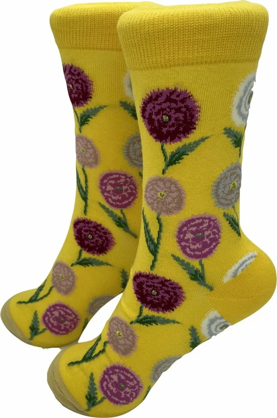Leuke Funsokken in het geel, voorzien van gekleurde bloemen. De sokken zijn van een superkwaliteit en voelen erg zacht aan. Ze zijn zeer aangenaam om zelf te dragen of als cadeau te geven. De sokken zijn gemaakt van 70% katoen, 25% polyester en 5% spandex.