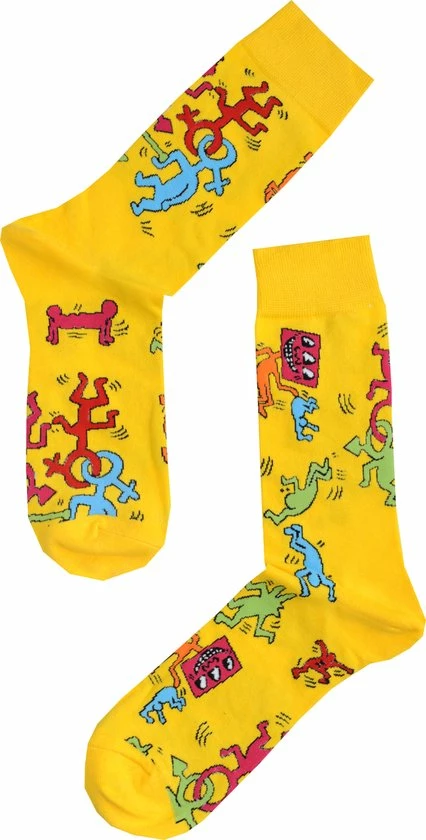 Op deze sokken gebeuren allemaal gekke dingen, ben jij net zo gek om deze sokken te dragen? Kleurrijke gekke poppetjes op een gele sok. Deze sokken zijn gemaakt van comfortabel en flexibel katoen.