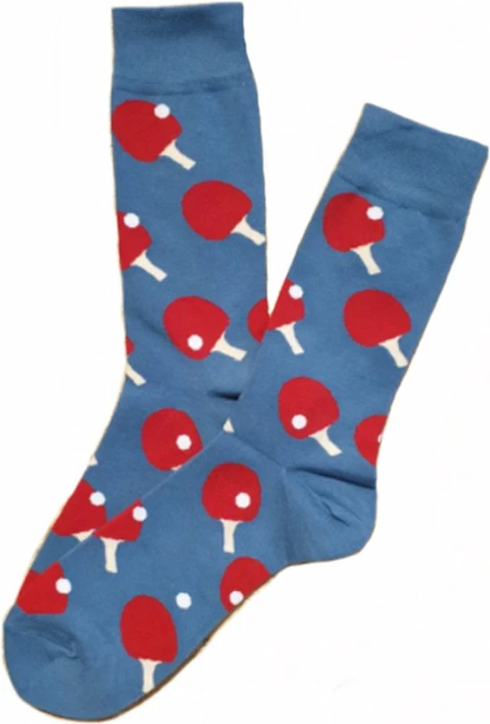 Deze super leuke blauw / rode tafeltennis sok is het ideale cadeau voor iedereen die helemaal gek is op de sport! Laat iedereen zien dat jij niks liever doet als tafeltennissen. Heb je een tafeltennis in de kantine staan op het werk of club? Het schijnt dat deze sokken extra geluk brengen.. Ook als niet tafeltennis fan zijn dit hartstikke leuke sokken om aan te trekken onder een net pak bijvoorbeeld. Verkrijgbaar in 2 maten.