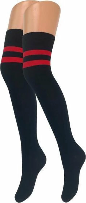 Dames overknee kousen van het merk SQOTTON in de kleur zwart met rode strepen. Deze overknee kousen zijn gemaakt van een katoenmix, hierdoor zijn de kousen zacht en comfortabel voor je huid. Dankzij de elastische niet knellende boord blijven deze overknee kousen goed zitten. Deze overknee kousen zijn one size, geschikt voor maat 35-42. De overknee kousen worden geleverd per paar.