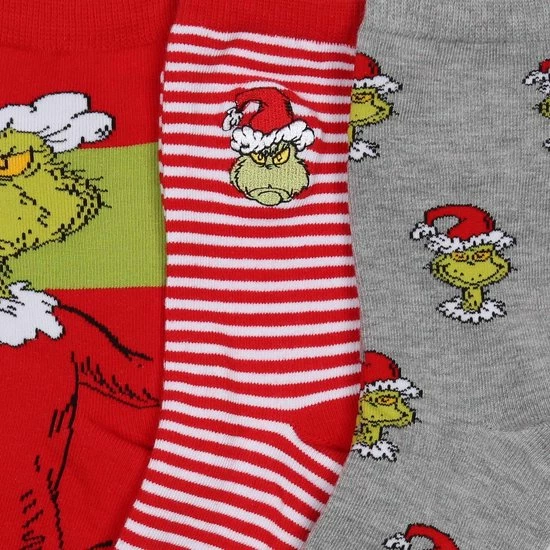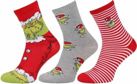 Een set van drie paar hoge sokken in een universele maat (37-42) met een terugkerende kerstgrinch afbeelding.