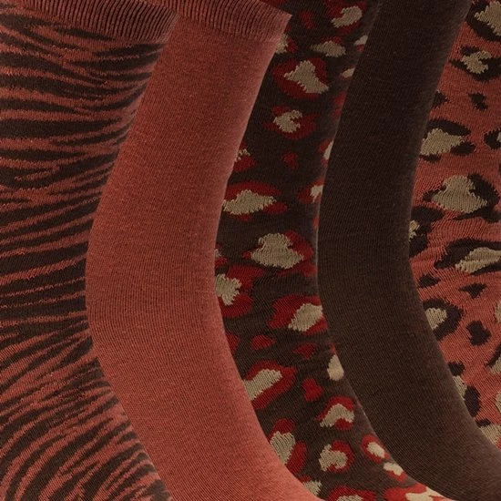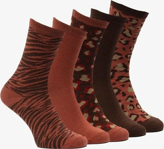 Vijf paar middellange sokken voor dames. Voorzien van verschillende dierenpintjes. De sokken zijn gemaakt van 75% katoen, 22% polyeser en 3% elastaan.