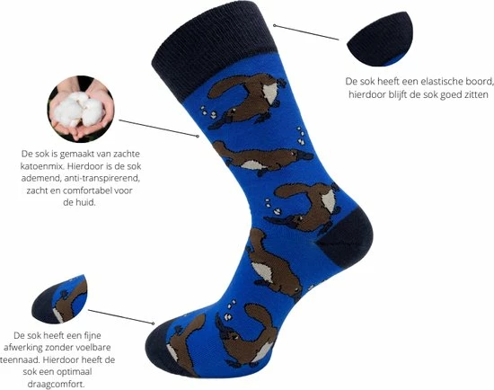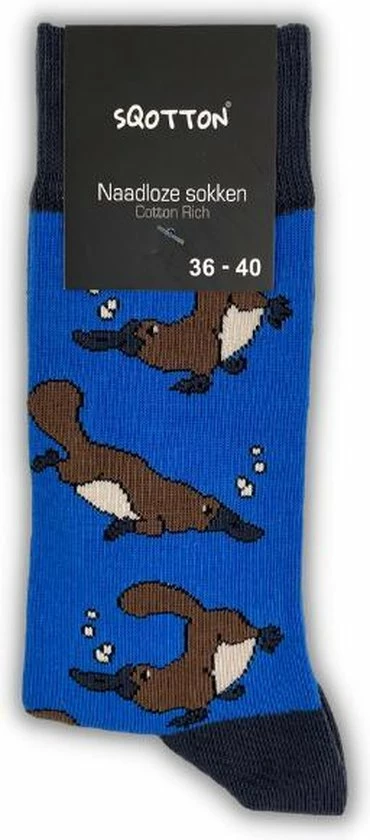 Vrolijke SQOTTON sokken met vogelbekdier print. Deze naadloze sokken met print hebben een hoog draagcomfort en zijn daarom ideaal voor dagelijks gebruik. De sokken zijn gemaakt van een zachte katoenmix. Hierdoor zijn de sokken ademend, anti-transpirerend en comfortabel voor je huid. De sokken hebben een elastische boord waardoor de sokken goed blijven zitten. Daarbij hebben deze vrolijke sokken een handgekettelde afwerking zonder voelbare naad bovenop de tenen. Een afwerking zoals deze wordt ook wel naadloos genoemd. Deze naadloze sokken met print zijn unisex, geschikt voor zowel dames als heren. De sokken worden per paar geleverd verkrijgbaar in de maten 36-40 en 41-46.