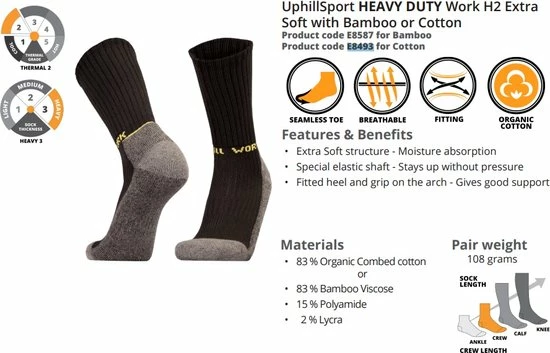 Deze heavy duty werksokken zijn ideaal voor intensief gebruik tijdens werkzaamheden binnen of buiten. De sokken zijn dik en warm en ideaal om te dragen in werkschoenen met harde neuzen. Ondanks dat de sokken dik en stevig zijn blijven ze goed ademen waardoor je voeten warm en droog blijven.