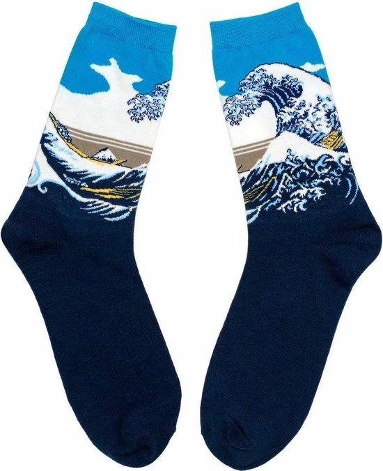 De naam van het afgebeelde schilderij op de sokken is: Great Wave off Kanagawa door Katsushika Hokusai
