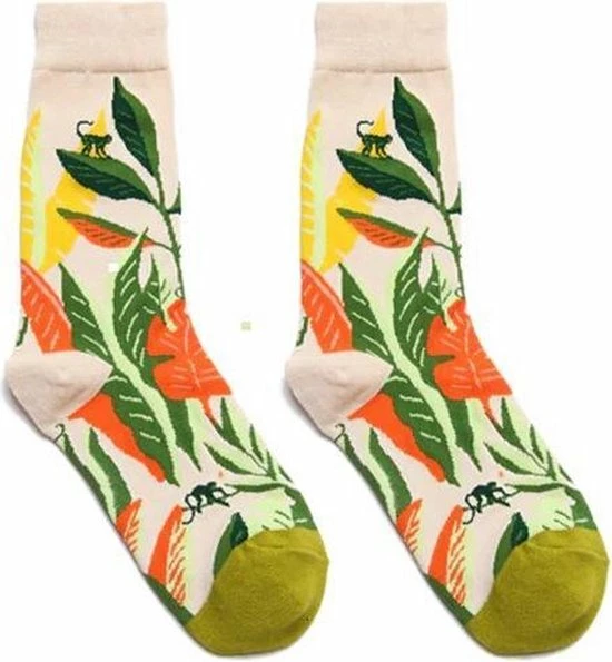 – Creme kleurige sokken met groen en oranje bladeren en aapjes